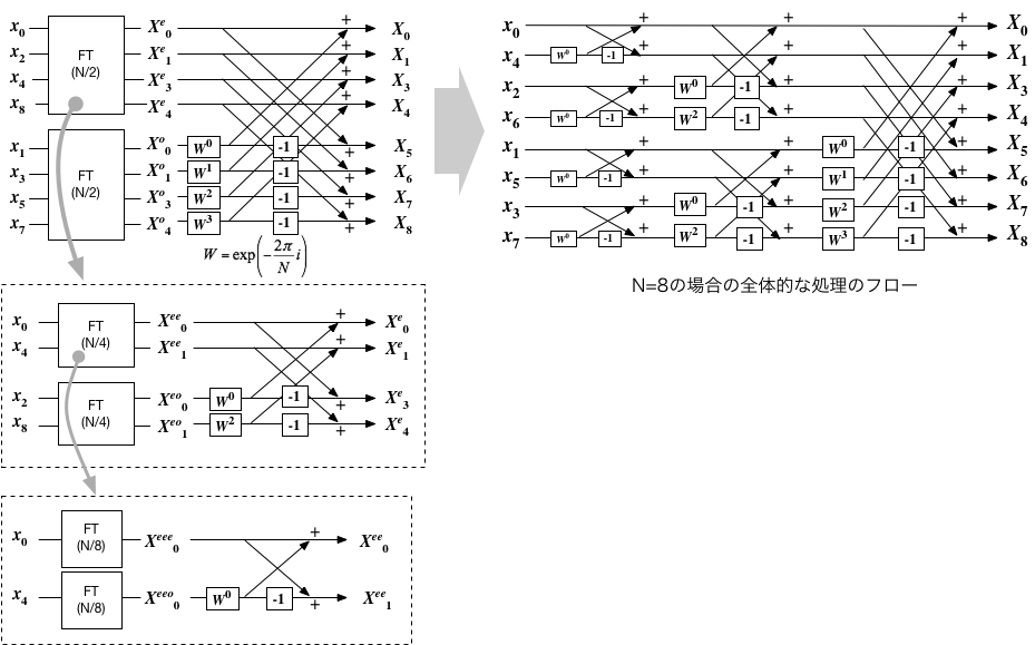 式(5)および(7)のルールに従って、$X_k$の計算をより小さなサイズのフーリエ変換に還元する過程を、$N=8$の場合について図示したのが以下である。