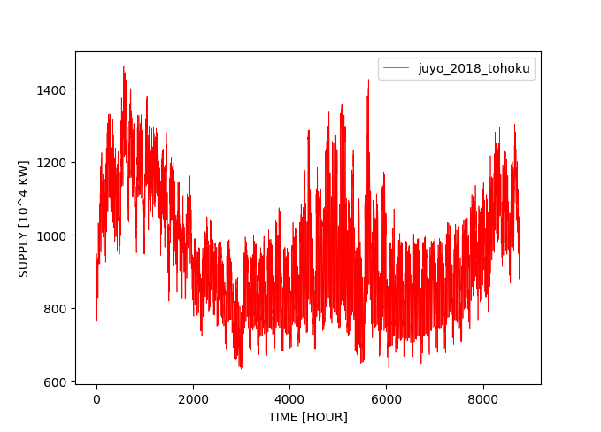 上記のコードを実行すると、2018年の元旦からの1時間毎の電力供給量が下のように表示される(細かい見え方は使用している環境で異なる)。
