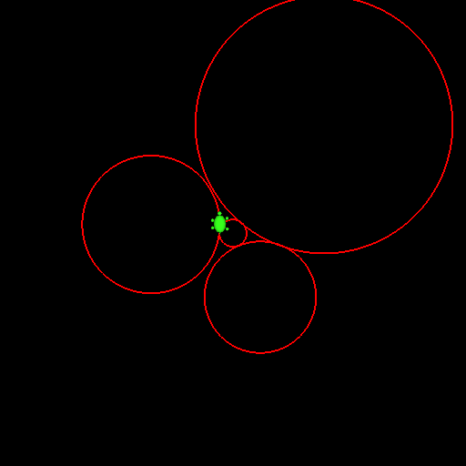 課題2を踏まえ、以下に示すの4つの円の配置について最適解を計算し、図4の例のように、亀場に最適な大きさの円を描くプログラムを作成せよ。