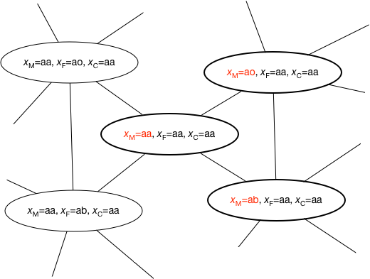 ここで、このネットワーク上を行ったり来たり移動している「旅人」を想像しよう。 旅人が状態 $(x_M=\textrm{aa}, x_F=\textrm{aa}, x_C=\textrm{aa})$ に居たとして、 変数のうちの一つ、例えば、$x_M$ に注目する。 そして、$x_M$が取り得る aa、ao、abという3つの可能性を(ベイズの公式に従って) $$ P( \textrm{M:}xy, \textrm{F:aa} | \textrm{C:aa} ) = \frac{P( \textrm{C:aa} | \textrm{M:}xy, \textrm{F:aa}) P(\textrm{M:}xy)} {\sum_{x,y} P( \textrm{C:aa} | \textrm{M:}xy, \textrm{F:aa}) P(\textrm{M:}xy)} $$ の確率で選び、その確率に応じて上図で太線の丸で示した状態のどれかに場所を移動する。
