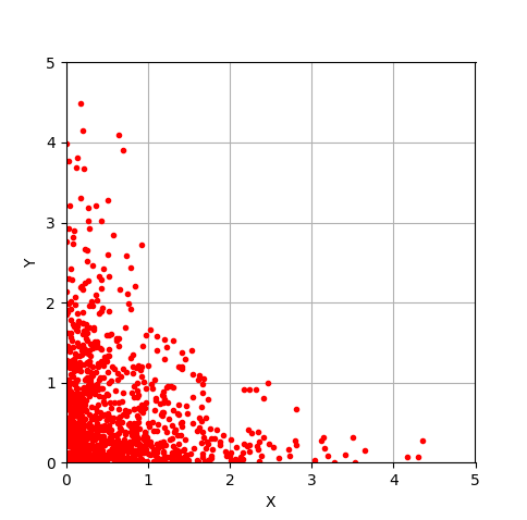 上記のアルゴリズムに従って、実際に $(x,y)$を出力し、その分布の様子を図のようにプロットするPythonコードを書いてみなさい。