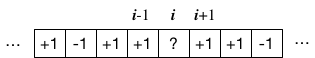 そこで、ギブスサンプリングの考え方に従って、$i$番目以外の場所の状態が与えられているとき、 $i$番目のスピンが-1あるいは+1を取る確率を計算してみよう。