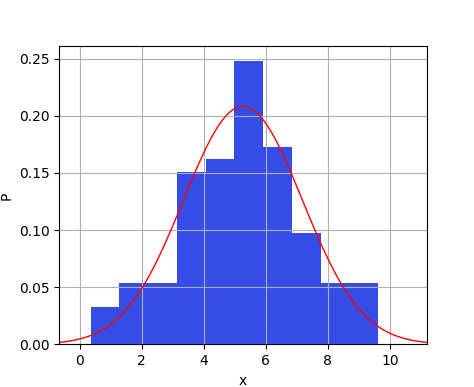Pythonには疑似乱数を扱うモジュールが提供されているが、一様乱数だけでなく、いくつかの確率密度関数に従う乱数を発生させることができる。 以下は、SciyPyを使って、正規乱数の系列を発生させ、その平均と標準偏差を最尤推定で求めて、データのヒストグラムを推定された分布関数の両方をプロットするコードの例である。
