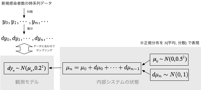 一方で、式(4)では、$y_n$の増分( $d y_n$と表記する)が、平均 $\mu_n$, 標準偏差 $\sigma$ の正規分布すると仮定しているのだから $$ d y_n \sim N(\mu_n, \sigma^2) $$ と表現できる。そして、この$d y_n$ が観測量に対応する。