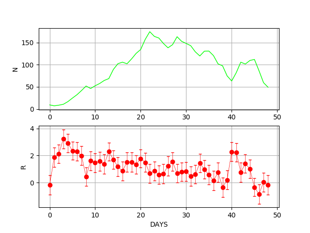 結果のプロットの例。 横軸は2020年3月18日からの日数。 上が東京都の新規患者数の5日間の移動平均。 下が$R$の推定値。 エラーバーは、サンプルされた$\mu_n$の標準偏差。 この場合、モデルで$\sigma$を一定としているので、それに近い値($\sigma/\gamma$)になっている。
