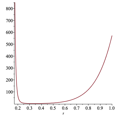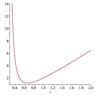 $w(x)$の平均(すなわち1次元球の体積)は、 $$ \bar{W} = \int_{-1}^{+1} \frac{1}{q(x)} q(x) dx = 2 $$ である。 他方で、$w(x)$の二乗平均は $$ \bar{W^2} = \int_{-1}^{+1} \left(\frac{1}{q(x)}\right)^2 q(x) dx = \sqrt{2 \pi } s^2 \int_{-1}^{+1} \exp\left(\frac{x^2}{2 s^2}\right) dx $$ となる。 これから、標準偏差$s$の関数として$w(x)$の分散 $$ \bar{W^2} - \bar{W}^2 $$ を数値計算してプロットすると、以下のようになる。 この値が小さいほど、より「的確」なサンプル値が得られるため、少ないサンプル回数でも良好な推定値が得られると期待できる。 プロットからは、$s$には最適値があり、それを外れると分散が急激に増大することがわかる。 そして、最適な$s$とは、提案分布が、$f(x)$になるべく近いかたちになるような値、と解釈できる。