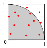 例えば、(二次元中の)半径1の円を考えてみよう。 そして、その面積を$S$とする。 $x$に0から1の範囲の一様乱数、$y$も同様とすると、点$(x,y)$は面積1の正方形の中に一様に分布するはずである。 そして、そのうちで、角度$\pi/4$の扇形 に入っているものの割合は、正方形と扇形の面積の比率、すなわち$S/4$となるだろう。 そうすると、$N$個の点を生成し、そのうち扇型に入っているものをカウント数した結果が$m$とすれば、 $$ \frac{m}{N} \approx \frac{S}{4} $$ すなわち、 $$ S \approx \frac{4m}{N} $$ と求まる。